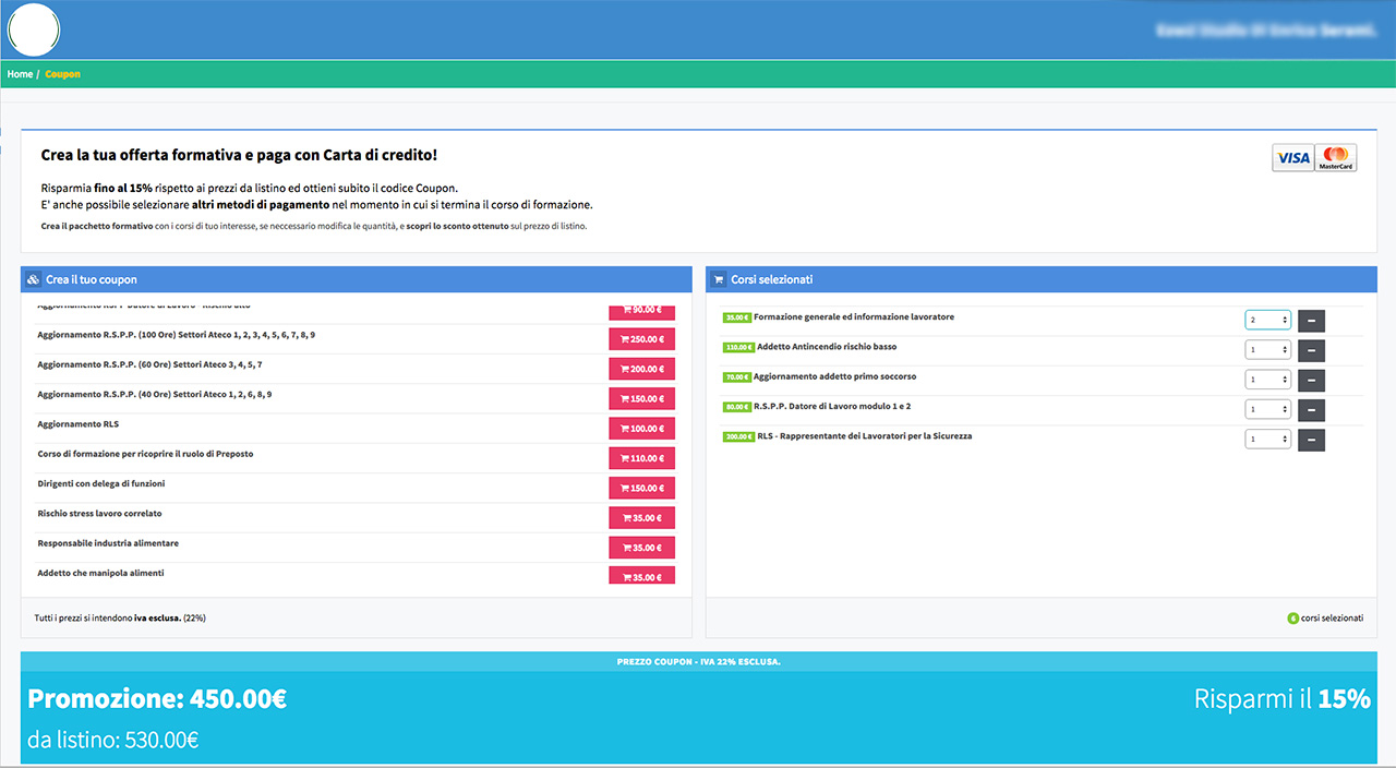 Assegnati i corsi ai vari dipendenti, e comunicato loro le credenziali di accesso, questi dovranno effettuare il login nella piattaforma loro dedicata (clicca qui) dove, una volta entrati, potranno seguire il corso assegnato, eseguire il test finale trascorsi i tempi di applicazione e, completato con successo il percorso didattico, generare il proprio attestato. Al superamento del test finale, il sistema richiederà di scegliere il metodo di pagamento: è proprio in questo momento che il dipendente dovrà inserire il codice coupon comunicatogli dal titolare, e procedere alla generazione dell’attestato.