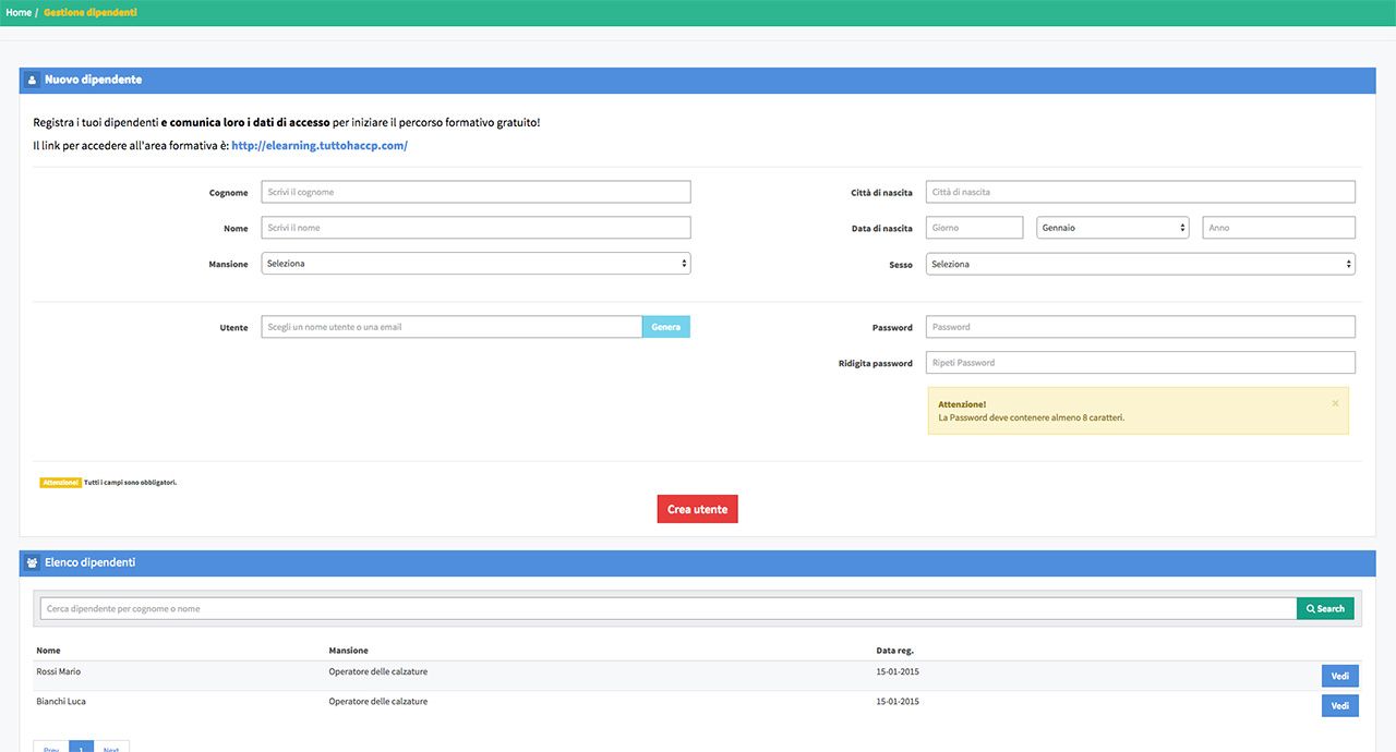 Nella parte superiore, trovi i campi da compilare per registrare un nuovo dipendente. Una volta registrati, i profili verranno visualizzati nella parte inferiore dove, cliccando sul pulsante “vedi” , verrai indirizzato nella pagina di dettaglio dello stesso: qui, nella parte inferiore, puoi scegliere quali corsi attivare per il dipendente prescelto.