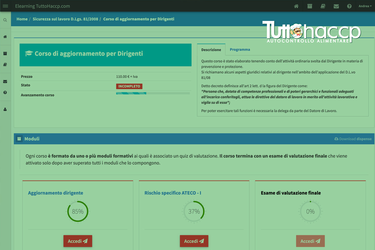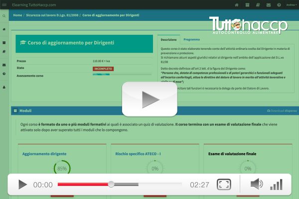 TuttoHaccp propone un Corso di Aggiornamento in materia di salute e sicurezza sul lavoro rivolto ai Dirigenti, per approfondire anche le tematiche della responsabilità amministrativa degli enti introdotta dal D. Lgs. 231/01 e della valutazione dei rischi e dell’etichettatura delle sostanze pericolose.